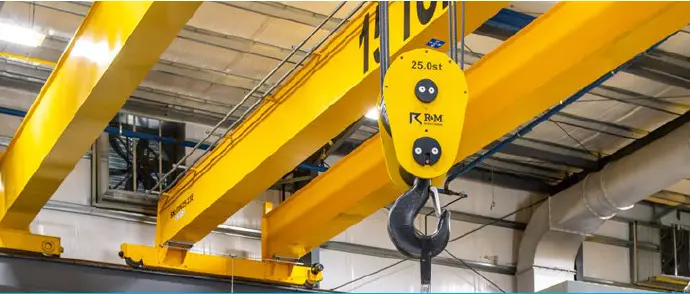 The company installed R&M Spacemaster SX wire rope hoists (5-ton capacity, spans of 40 to 65 feet), built to CMAA Class C specifications with variable-frequency drive (VFD) controls and radio remote operation. The new installation is reliable and moves slow with high precision. With additional cranes now installed across the facility, the partnership continues to deliver high-quality results with minimal downtime.