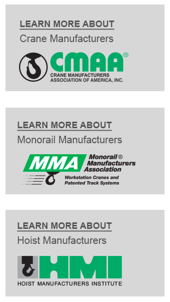 The members of the Crane Manufacturers Association of America (CMAA) represent the industry’s leading suppliers of overhead crane systems. They design, manufacture, assemble, install, and service overhead cranes and components. Collectively, CMAA members have installed more than 30,000 cranes in North America in the last decade. The organization offers a variety of crane safety and inspection resources. These include buyers’ guides, engineering specifications, OSHA Alliance safety tip and fact sheets, inspection and maintenance checklists, safety seminars and more. Learn more at www.MHI.org/CMAA.